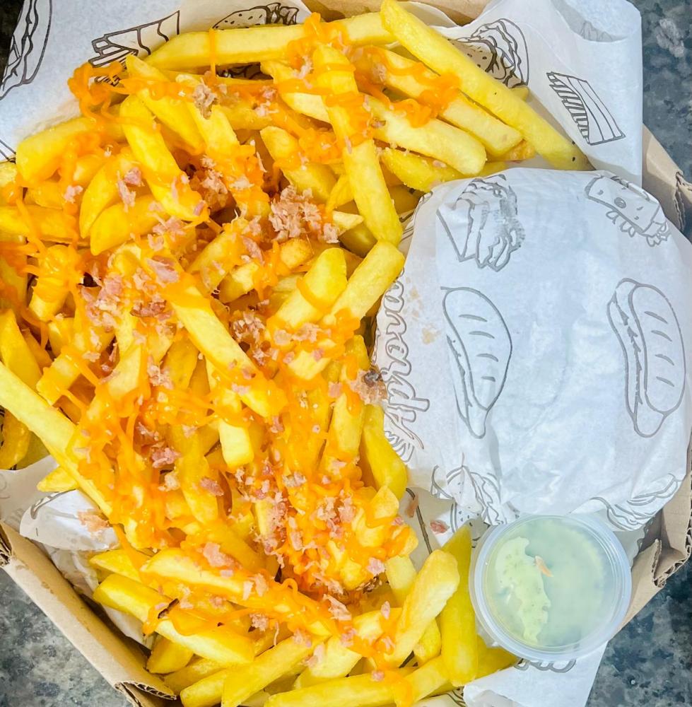 1X BURGUER E MUITA BATATA COM CHEDDAR E FAROFINHA
