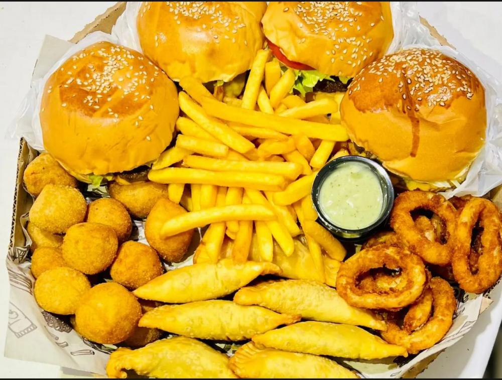 4 X BURGUER + BATATA + 12 SALGADOS + 8 PASTEIS + ANEIS DE CEBOLA